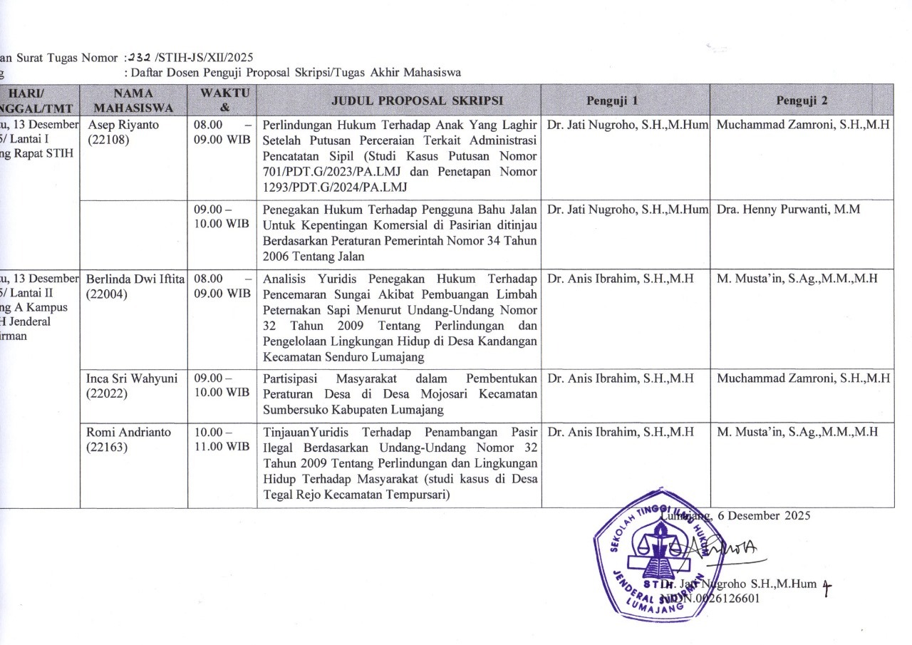 Berikut adalah Jadwal Seminar Proposal Mahasiswa STIHJS yang akan dilaksanakan pada hari Sabtu, 13 Desember 2025. Kepada mahasiswa yang namanya tertera dalam tabel di bawah ini untuk dapat hadir 15 menit lebih awal dari waktu yang telah ditentukan.