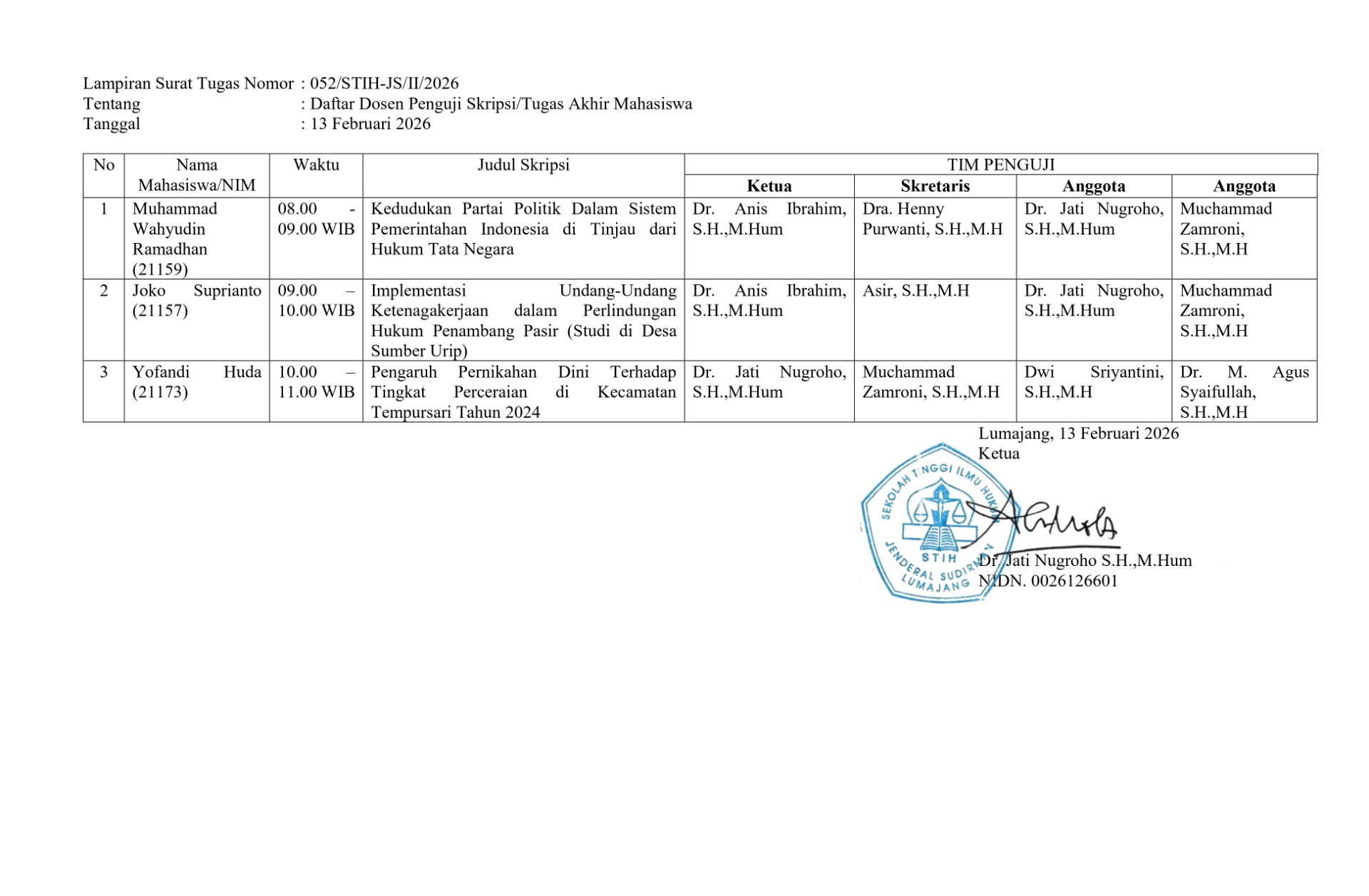 STIHJS yang akan dilaksanakan pada hari Senin, 16 Februari 2026. Kepada mahasiswa yang namanya tertera dalam tabel di bawah ini untuk dapat hadir 15 menit lebih awal dari waktu yang telah ditentukan.
